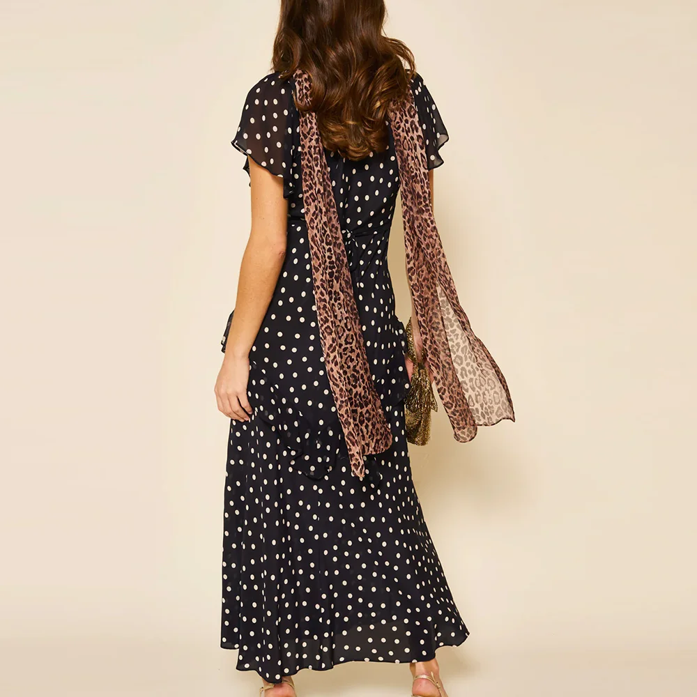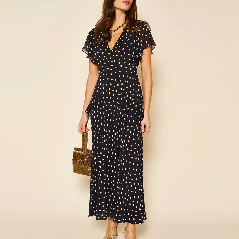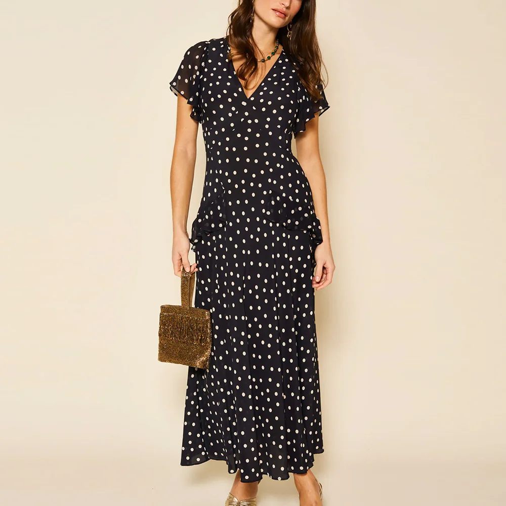Factory Oem High Quality v Neck Casual Short Sleeve Dresses Custom Polka Dot Print Ruffled Ladies Midi Chiffon Dress